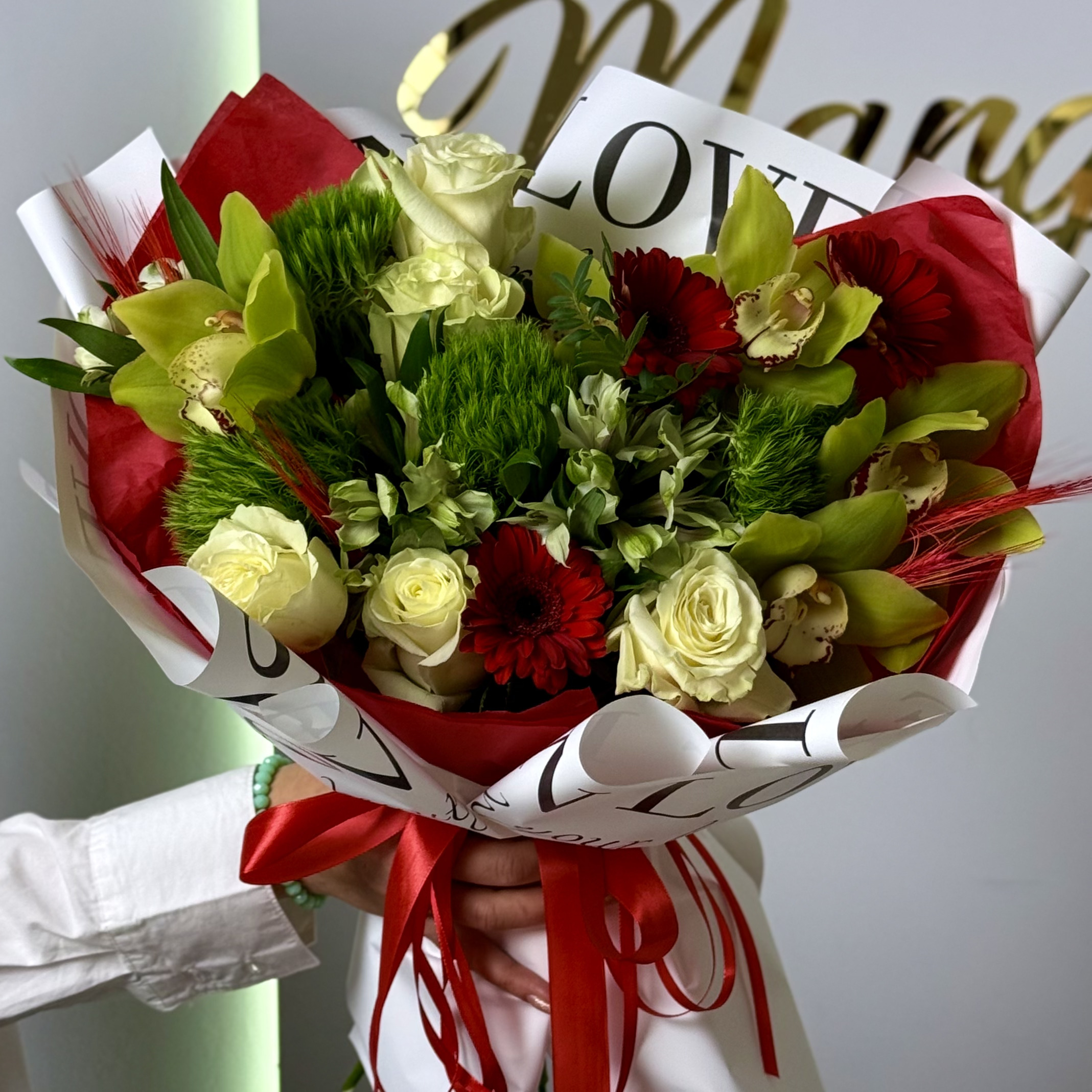 Wyjątkowa kompozycja w połączeniu klasycznej czerwieni i świeżej zieleni, w której dominują zielone kwiaty. To bukiet pełen harmonii, elegancji i naturalnej lekkości, idealny dla osób, które lubią oryginalne, a zarazem wyraziste aranżacje.