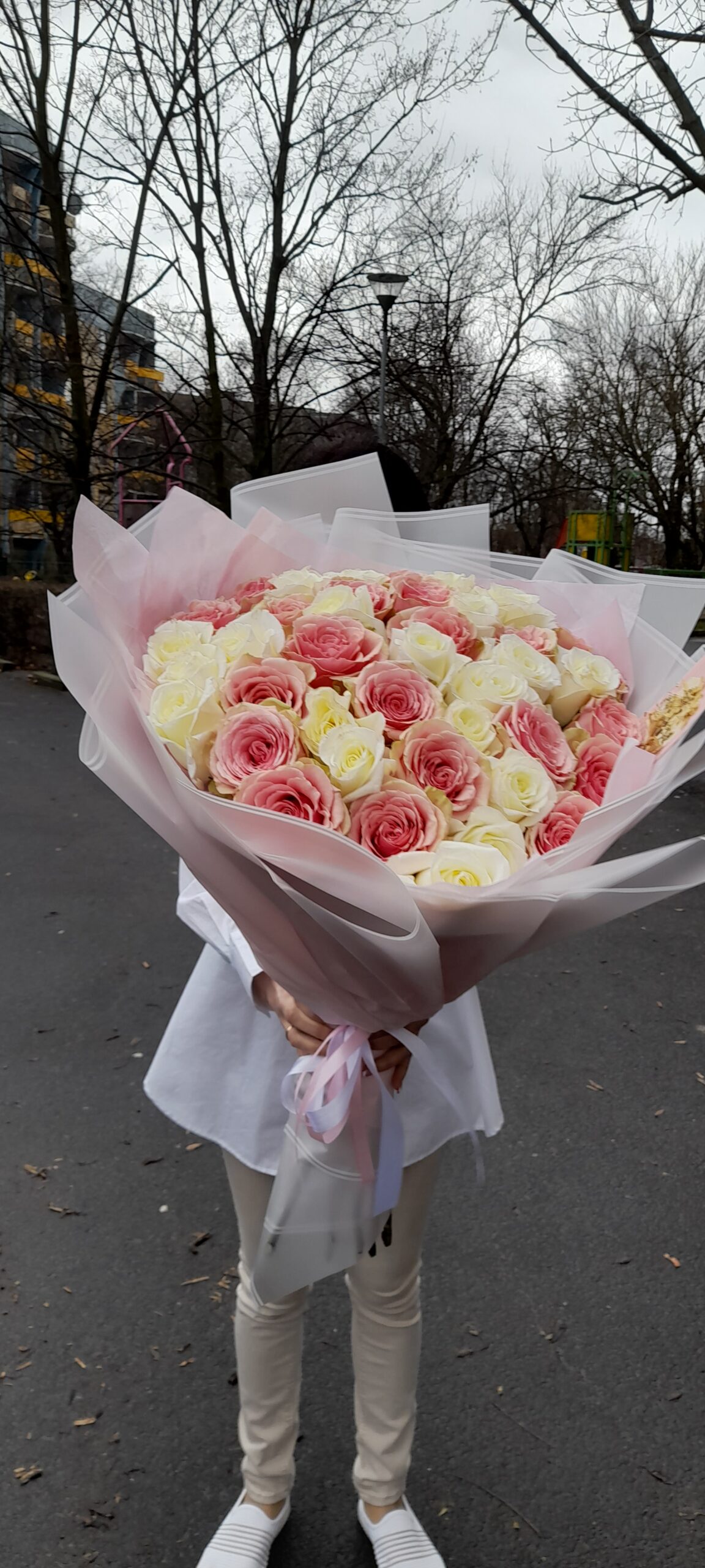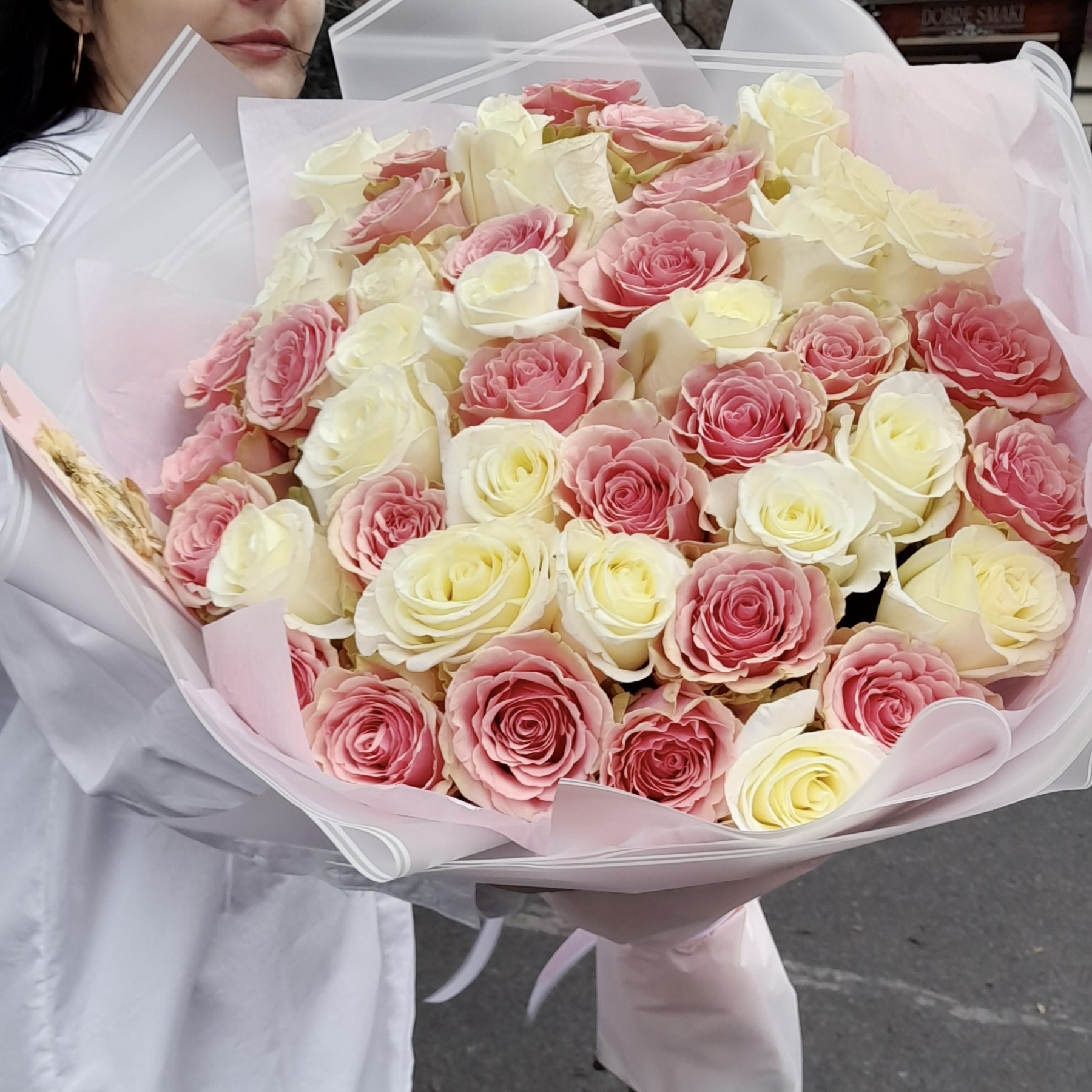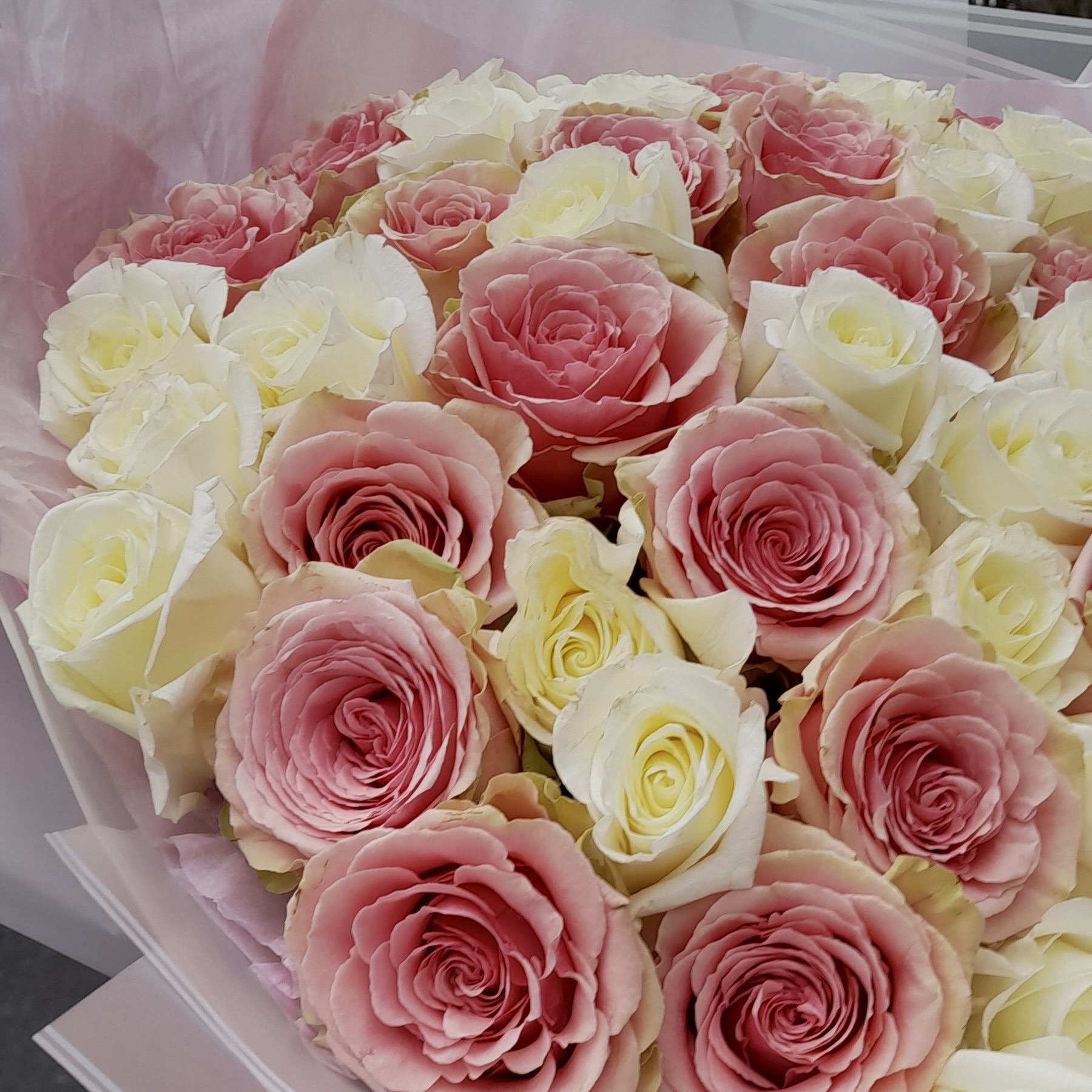 Delikatny i harmonijny bukiet z białych i różowych róż. Połączenie subtelnej bieli i romantycznego różu tworzy kompozycję pełną świeżości, lekkości i klasy. Idealny na urodziny, rocznice, śluby lub jako czuły gest bez okazji. Każdy bukiet układamy ręcznie, wybierając najpiękniejsze, świeże róże.