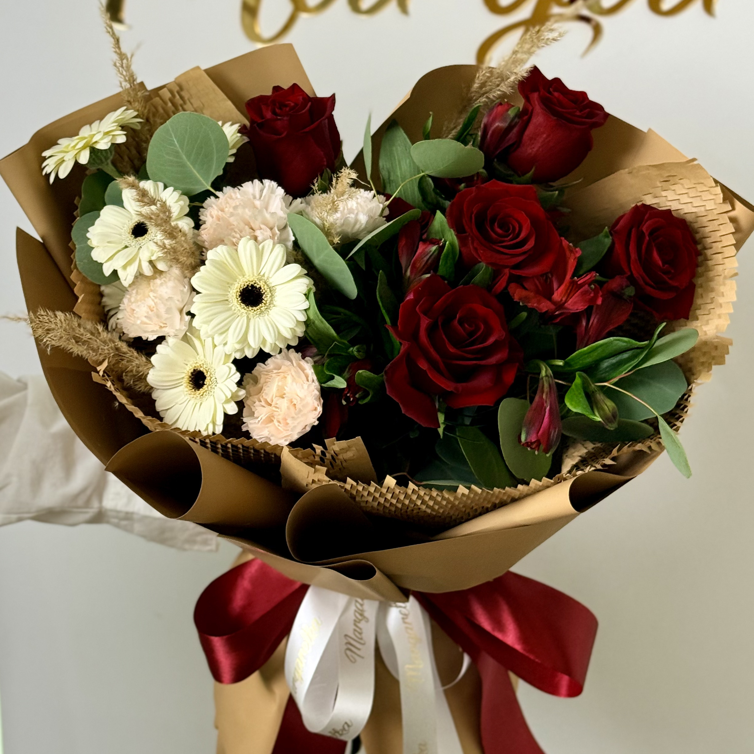 Kontrastowy bukiet z czerwonych róż i białych gerber symbolizuje miłość, szczerość i czystość uczuć. Połączenie intensywnej czerwieni z delikatną bielą tworzy elegancką i nowoczesną kompozycję, idealną dla osób ceniących klasykę w świeżym wydaniu.