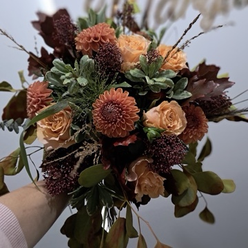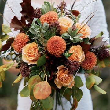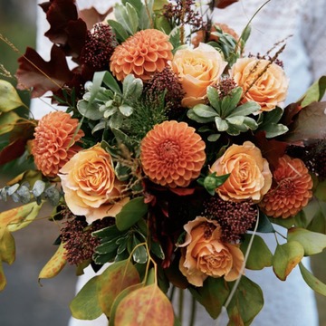 Energetyczny i pełen ciepła ślubny bukiet w pomarańczowych odcieniach, wykonany ze świeżych, sezonowych kwiatów. Intensywne, słoneczne barwy dodają stylizacji panny młodej wyjątkowego blasku, lekkości i nowoczesnego charakteru.