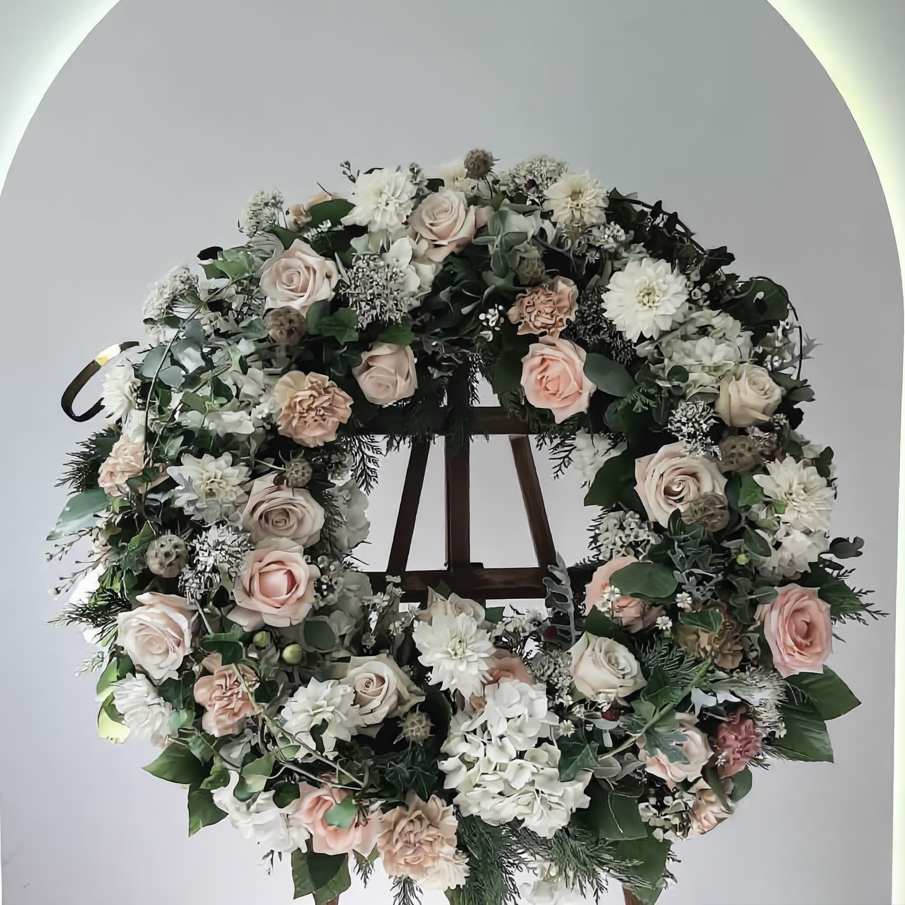 Wieniec pogrzebowy w stylu rzymskim, utrzymany w jasnej kolorystyce. Kompozycja składa się z delikatnych liści laurowych i subtelnych kwiatów, których pastelowe odcienie podkreślają elegancję i spokój. Całość emanuje harmonijnym, łagodnym światłem, tworząc wyrafinowany i dostojny symbol pamięci i szacunku.